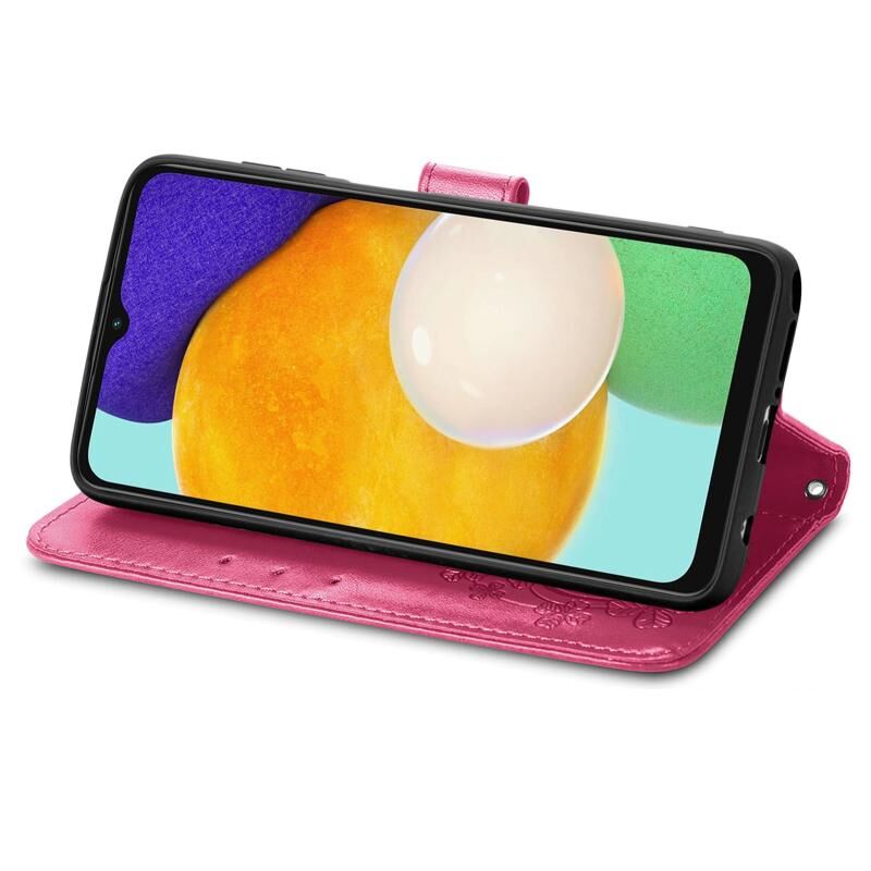 Για Samsung Galaxy A13 5G Four-leaf Clasp ανάγλυφη δερμάτινη θήκη τηλεφώνου με κορδόνι & υποδοχή για κάρτες & πορτοφόλι & λειτουργία βραχίονα (Magenta)