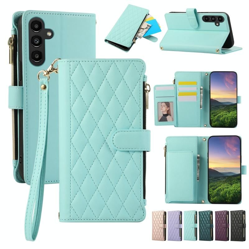 Θήκη κινητού τηλεφώνου Samsung Galaxy A13 5G, δερμάτινη με φερμουάρ και ρόμβους (Κυανό)