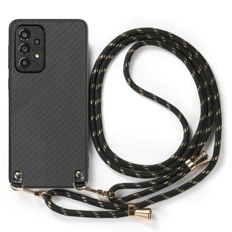 Για Samsung Galaxy A14 4G / 5G Carbon Fiber Texture δέρμα πίσω κάλυμμα τηλέφωνο υπόθεση με λουράκι σταυρού (μαύρο)