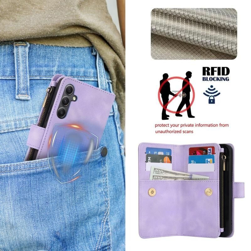 Για Samsung Galaxy A14 4G / 5G Dream 9-Card φερμουάρ πορτοφόλι RFID δερμάτινη θήκη τηλεφώνου με κορδόνι (μωβ)