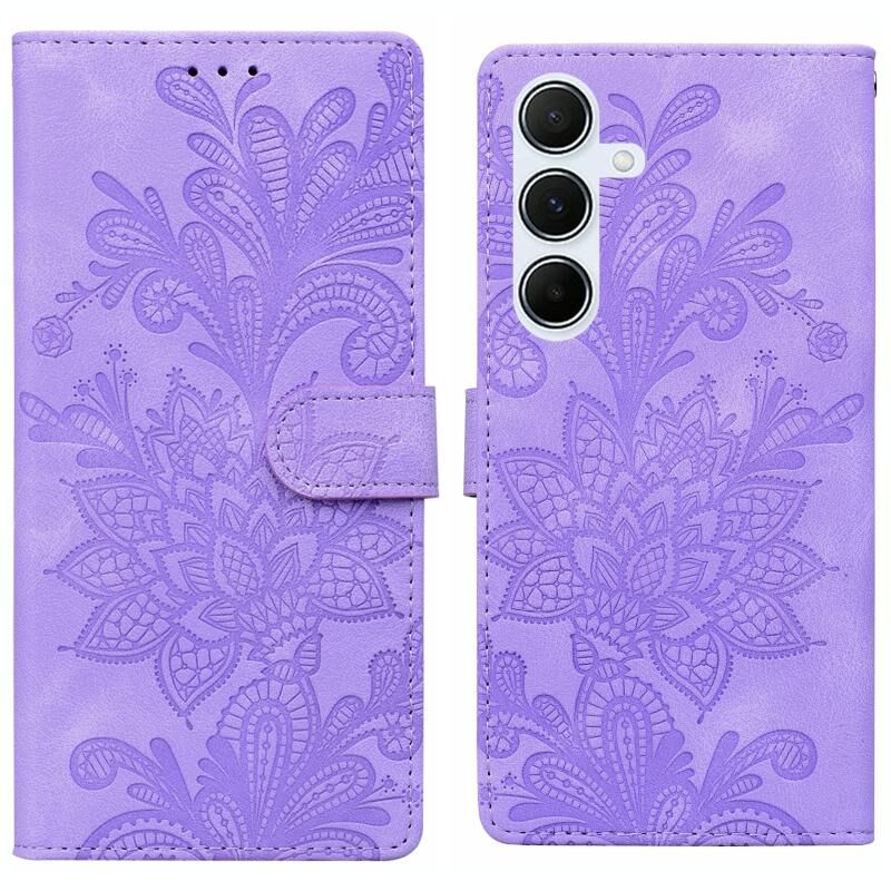 Θήκη τηλεφώνου Samsung Galaxy A14 4G / 5G από δερματίνη PU με μαγνητικό κούμπωμα, δαντελένιο floral ανάγλυφο και λουρί καρπού (Πράσινο)