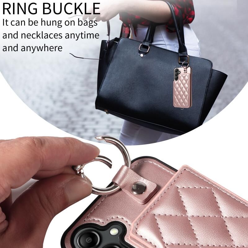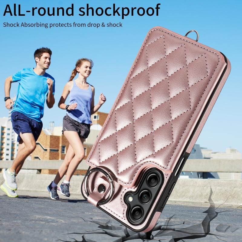 Για Samsung Galaxy A14 4G / 5G Rhombic υφή κάρτα τσάντα υπόθεση τηλεφώνου με σύντομο κορδόνι (Ροζ χρυσός)