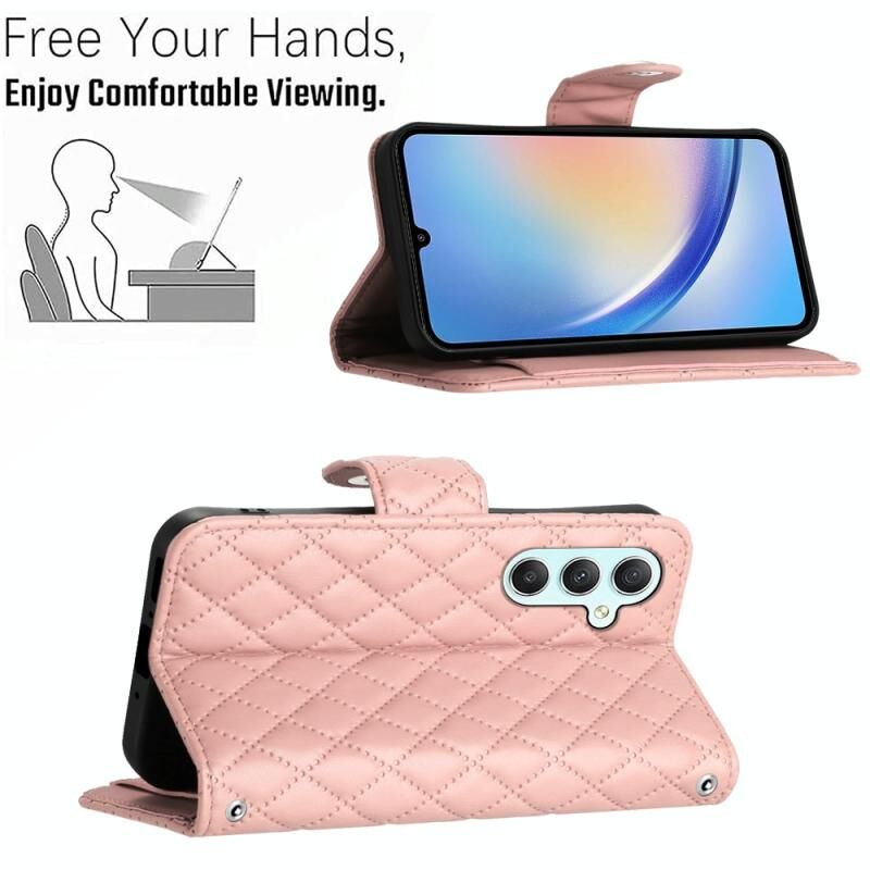 Για Samsung Galaxy A14 4G / 5G Rhombic υφή Flip δερμάτινη θήκη τηλεφώνου με μακρύ κορδόνι (Coral Pink)