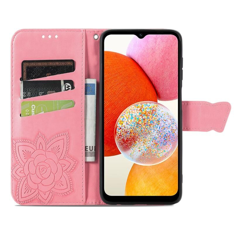 Θήκη τηλεφώνου Samsung Galaxy A14 4G με ανάγλυφο σχέδιο πεταλούδας, λουλουδιών και δέρμα (ρόζ)