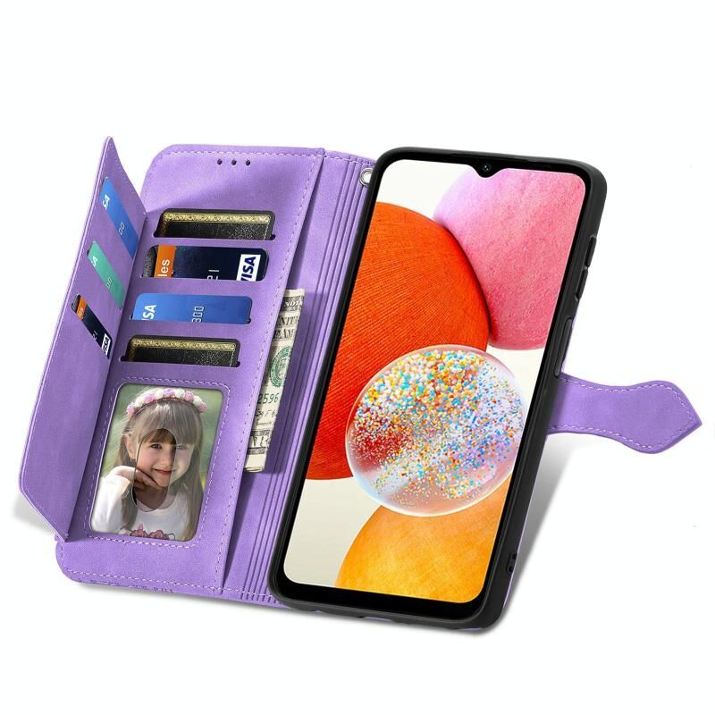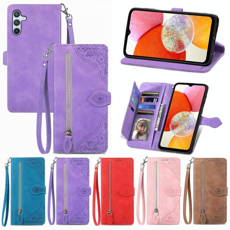 Για Samsung Galaxy A14 4G ανάγλυφο λουλούδι φερμουάρ δερμάτινη θήκη τηλεφώνου (μωβ)