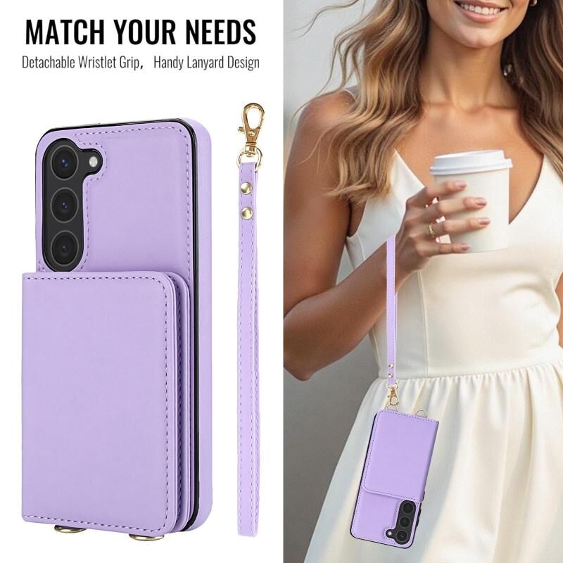 Θήκη κινητού Samsung Galaxy A14 5G / 4G από δέρμα με διπλή αγκράφα, πορτοφόλι και λουρί για τον ώμο (ανοιχτό μωβ)