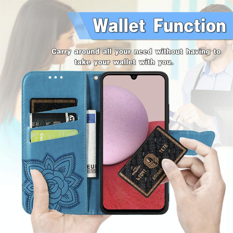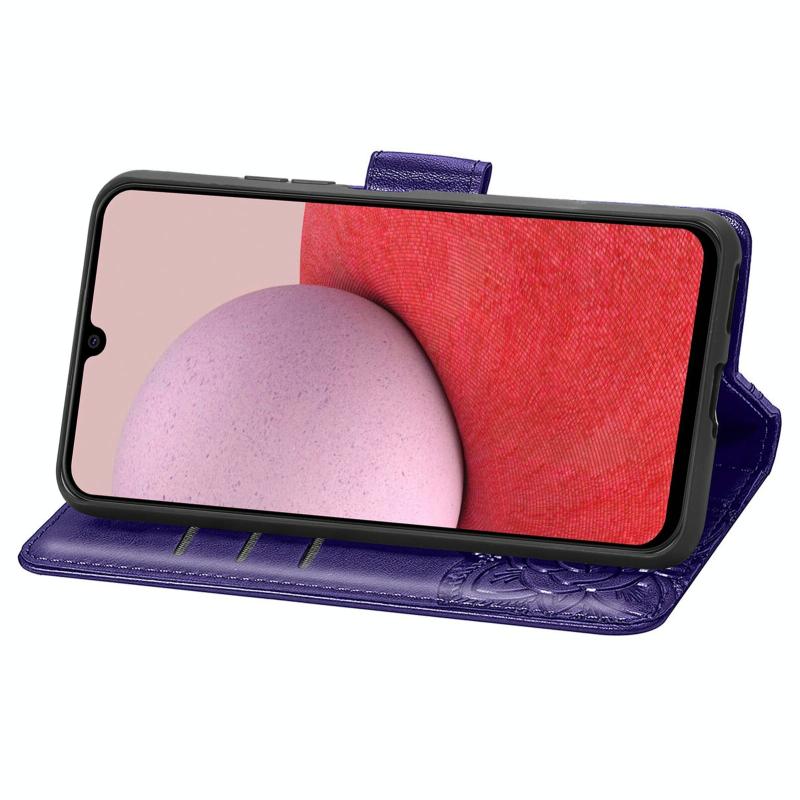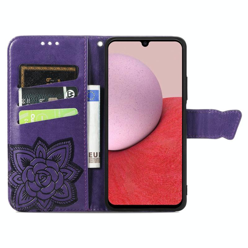 Θήκη τηλεφώνου Samsung Galaxy A14 5G από δέρμα με ανάγλυφο σχέδιο πεταλούδας και λουλουδιών (Μωβ)