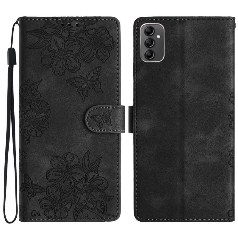Θήκη τηλεφώνου Samsung Galaxy A14 5G Cherry Blossom Butterfly με ανάγλυφη υφή PU (Μαύρο)