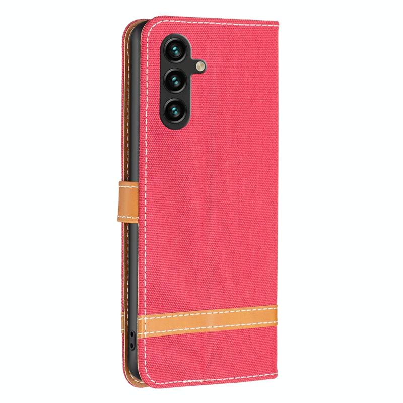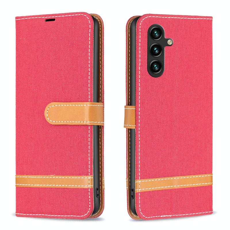 Θήκη τηλεφώνου Samsung Galaxy A14 5G σε χρώμα Μαύρο, με υφή denim και δερμάτινη υφή (Color Block). (Κόκκινο)