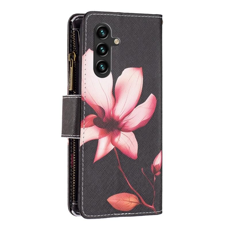 Θήκη τηλεφώνου Samsung Galaxy A14 5G από δέρμα με φερμουάρ και πολύχρωμο σχέδιο (Λωτός)