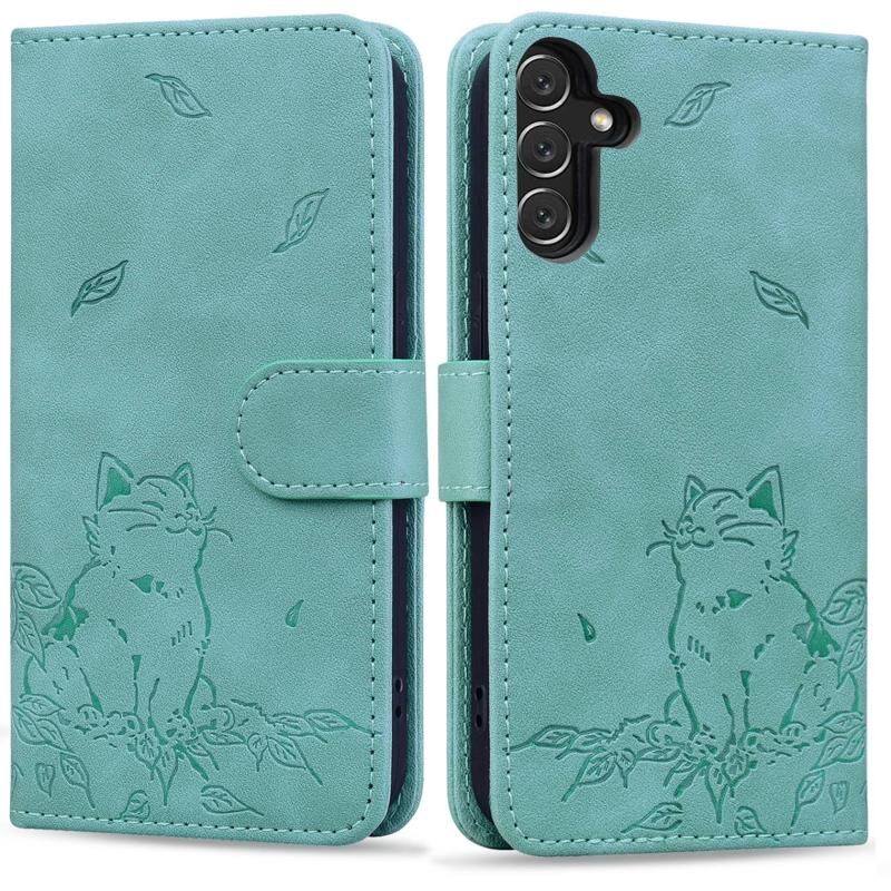Θήκη τηλεφώνου δερμάτινη ανάγλυφη με χαριτωμένη γάτα για Samsung Galaxy A14 5G (Πράσινη)