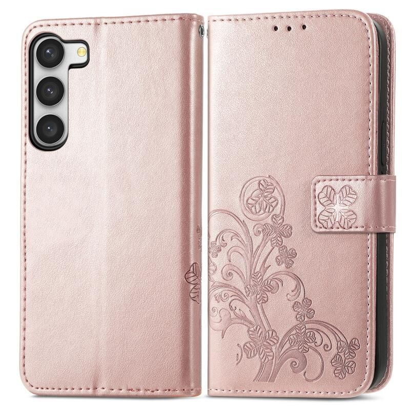 Για το Samsung Galaxy A14 5G Four-leaf Clasp ανάγλυφη αγκράφα δερμάτινη θήκη τηλεφώνου (Ροζ χρυσός)