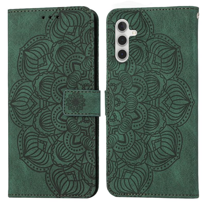 Θήκη τηλεφώνου Samsung Galaxy A14 5G, δερμάτινη, τύπου flip, με ανάγλυφο σχέδιο Mandala (Πράσινη)