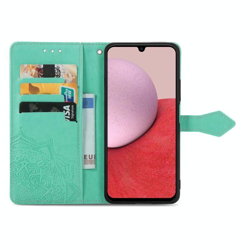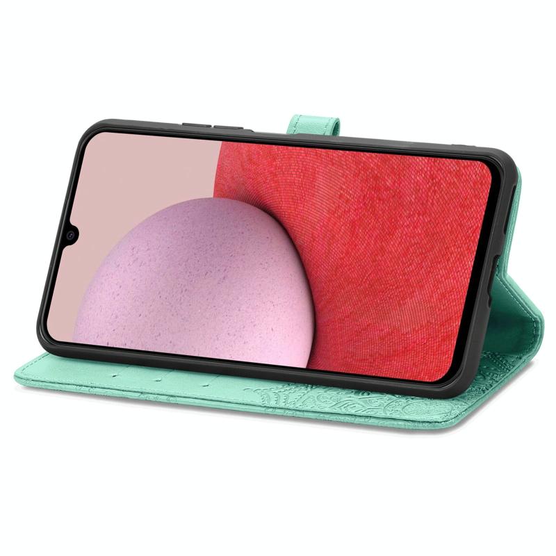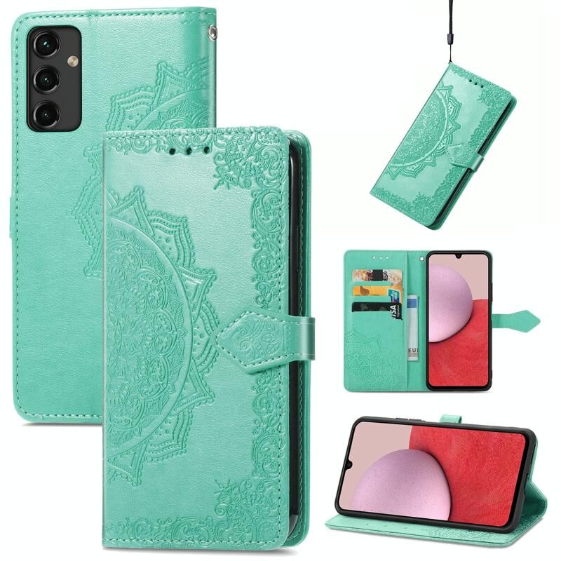 Θήκη τηλεφώνου Samsung Galaxy A14 5G από δέρμα με ανάγλυφο σχέδιο μανταλά και λουλουδιών (Μπλε)