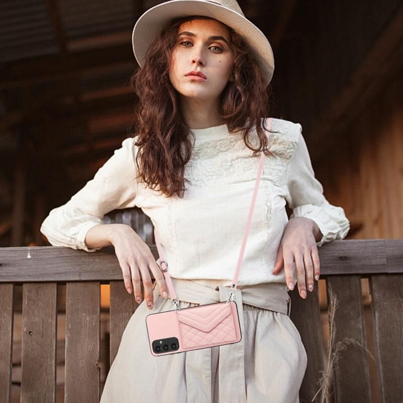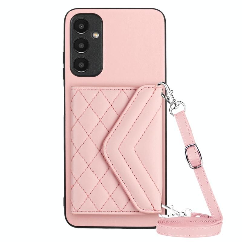 Για Samsung Galaxy A14 5G Rhombic υφή κάρτα τσάντα RFID υπόθεση τηλεφώνου με μακρύ κορδόνι (Rose Gold)