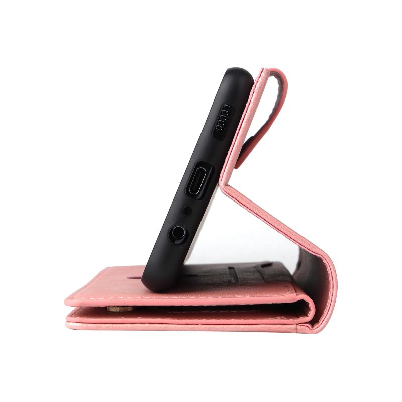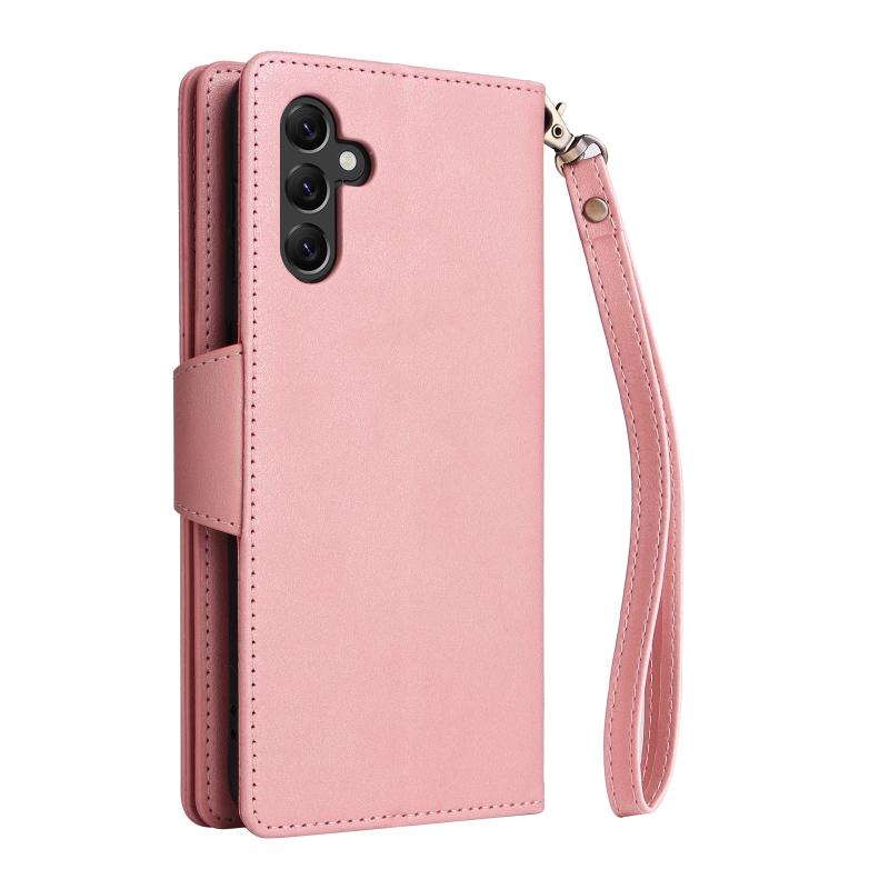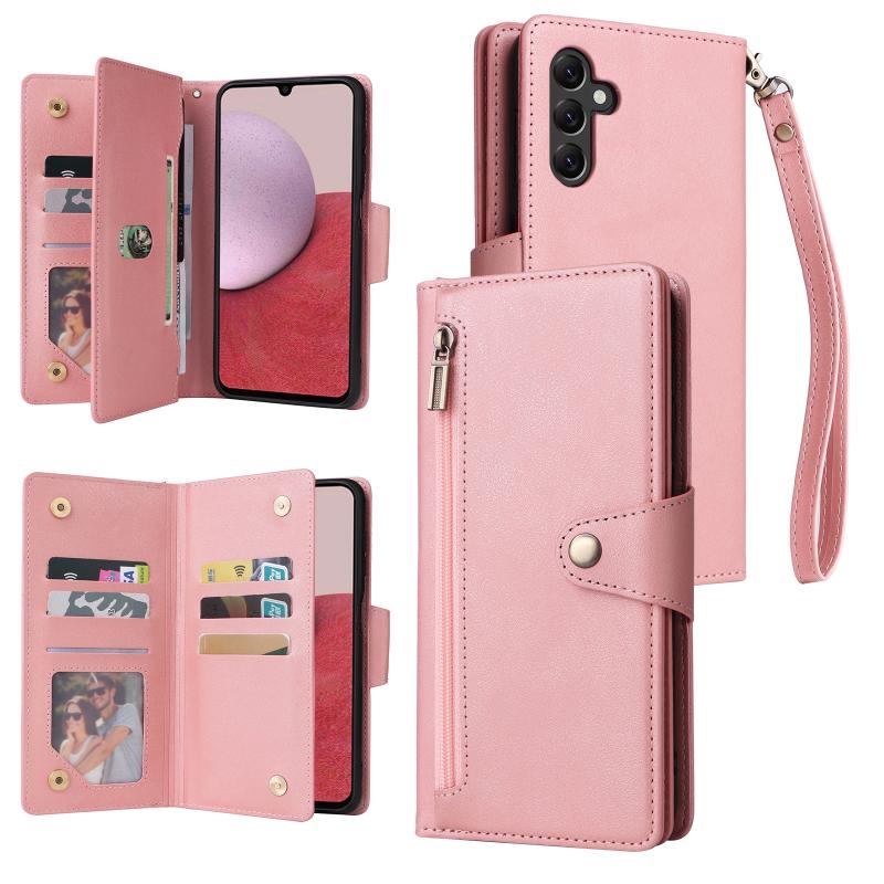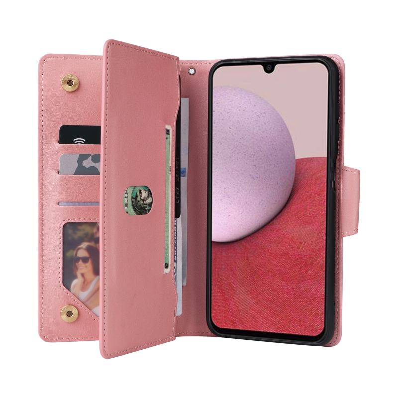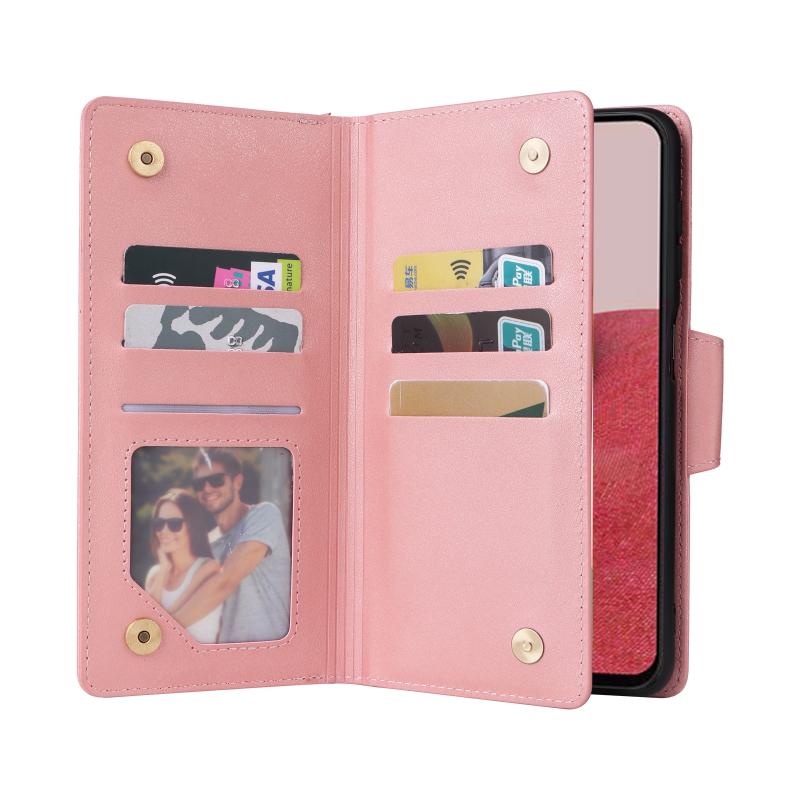 Θήκη τηλεφώνου Samsung Galaxy A14 5G από δέρμα με τριπλή πτυχή, με αγκράφα καρφί και θήκη για 9 κάρτες (Ροζ χρυσός)
