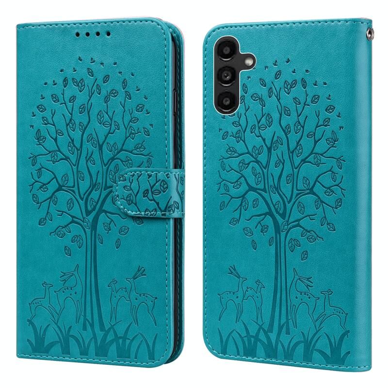 Για Samsung Galaxy A14 5G δέντρο & ελάφια μοτίβο εκτύπωση οριζόντια Flip δέρμα τηλέφωνο υπόθεση (Μπλε)