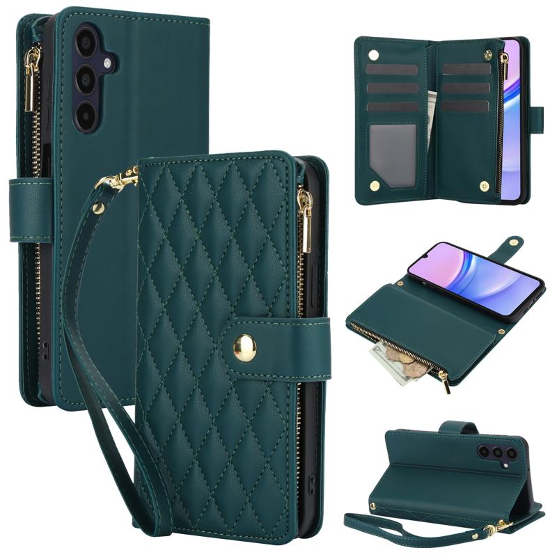 For Samsung Galaxy A15 4G / 5G YM016 Rhombic Zipper Card Wallet Leather Phone Case with Lanyard(Green)