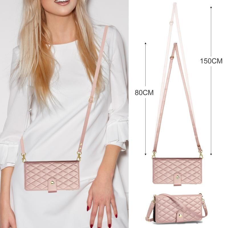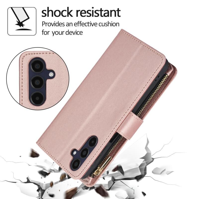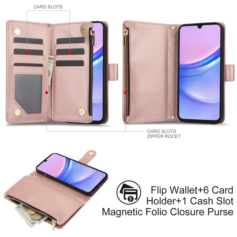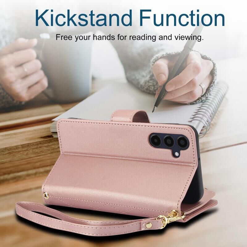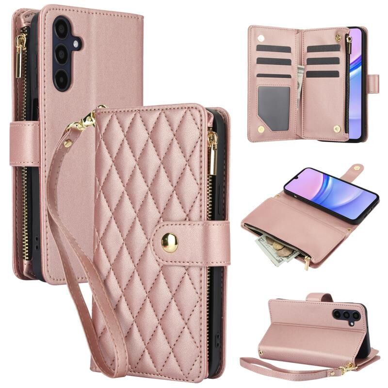 Θήκη τηλεφώνου Samsung Galaxy A15 4G / 5G YM016 με φερμουάρ, σχέδιο ρόμβου, δερμάτινη με λουρί (Ροζ χρυσός)
