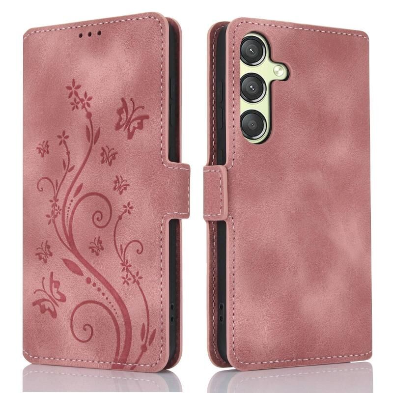 Θήκη τηλεφώνου Samsung Galaxy A15 4G, ανάγλυφη δερμάτινη με σχέδιο πεταλούδας, λουλουδιών και έρωτα (Χρυσορόδινο)