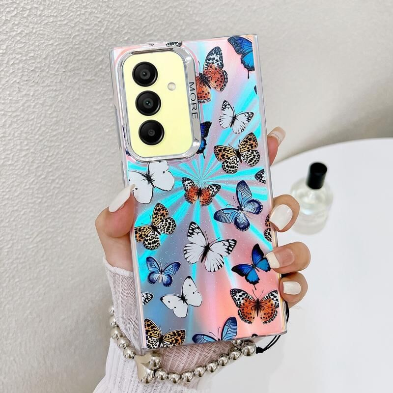 Για Samsung Galaxy A15 5G Electroplating λέιζερ πεταλούδα υπόθεση τηλεφώνου με λουράκι καρπού (χρώμα πεταλούδες AB1)