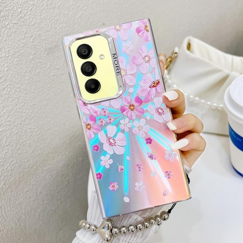 Θήκη τηλεφώνου για Samsung Galaxy A15 5G με ηλεκτρολυτική επίστρωση, λουλούδι laser και λουρί καρπού (Λευκό Λουλούδι AH10)