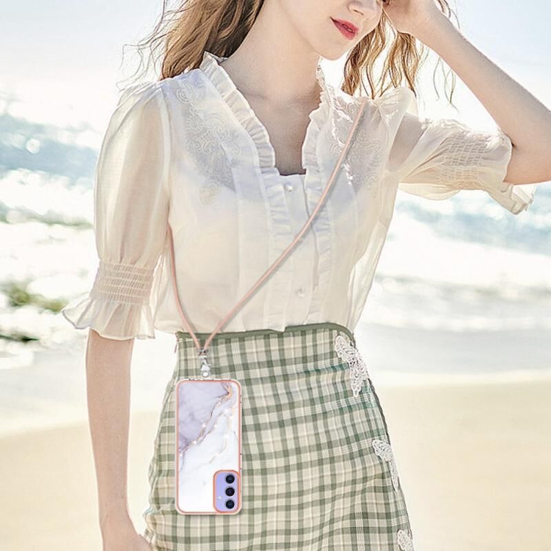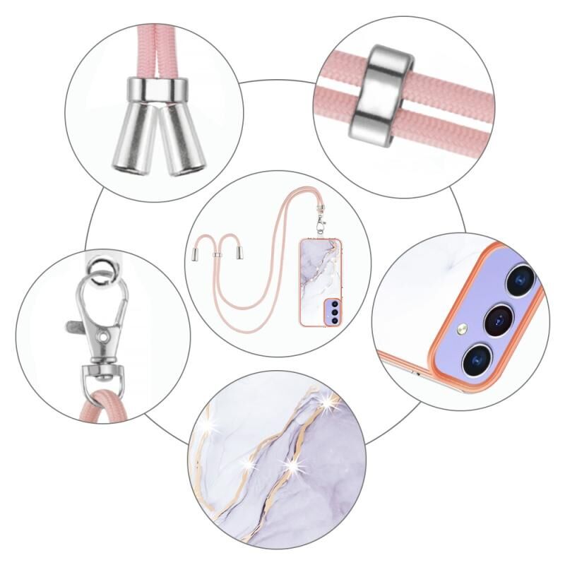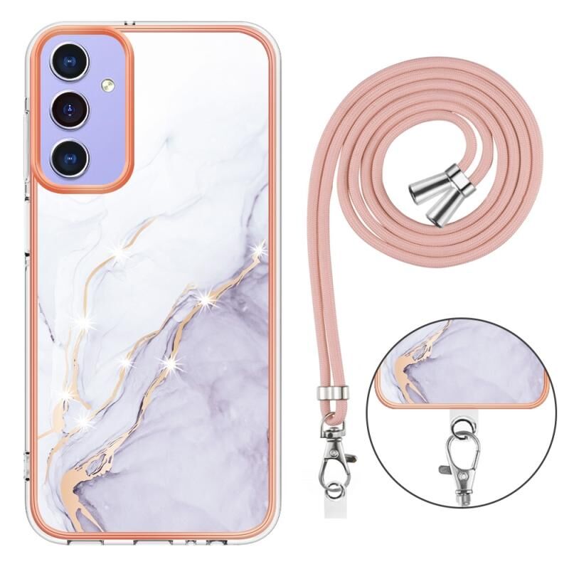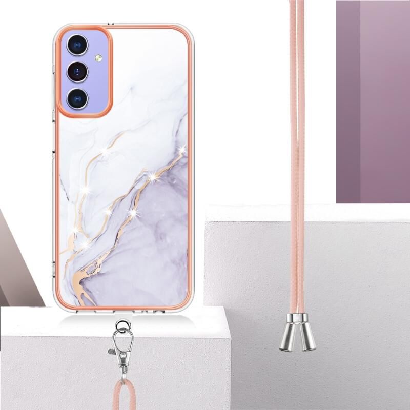Θήκη τηλεφώνου Samsung Galaxy A15 5G με επιμετάλλωση, σχέδιο μάρμαρου, διπλής όψης IMD με κορδόνι (Μωβ 002)