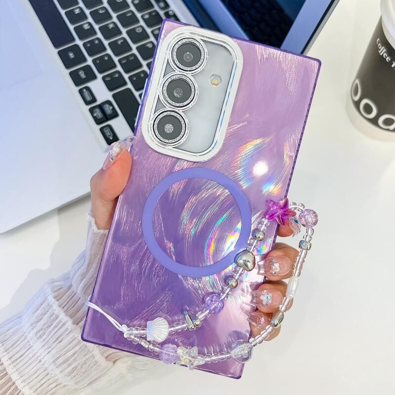 Θήκη κινητού τηλεφώνου Samsung Galaxy A15 5G με υφή επιμετάλλωσης, βραχιόλι, MagSafe, TPU και μεμβράνη φακού με γκλίτερ (Μωβ νήμα πέρλας)