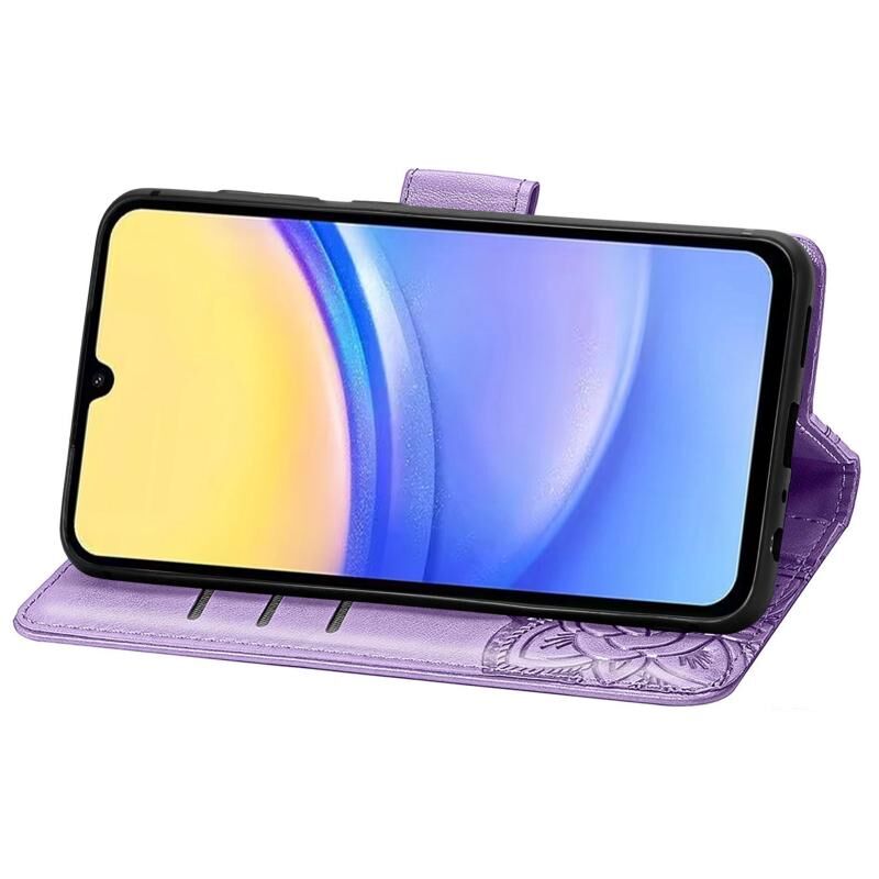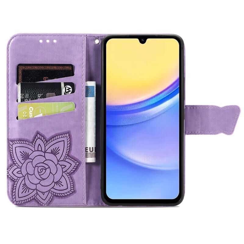 Θήκη τηλεφώνου Samsung Galaxy A15 με ανάγλυφο σχέδιο πεταλούδας και λουλουδιών από δέρμα (Λεβάντα)