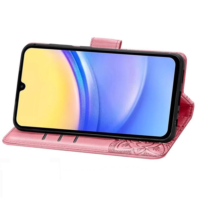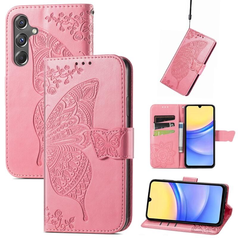 Θήκη τηλεφώνου Samsung Galaxy A15 με ανάγλυφο σχέδιο πεταλούδας και λουλουδιών από δέρμα (ρόζ)