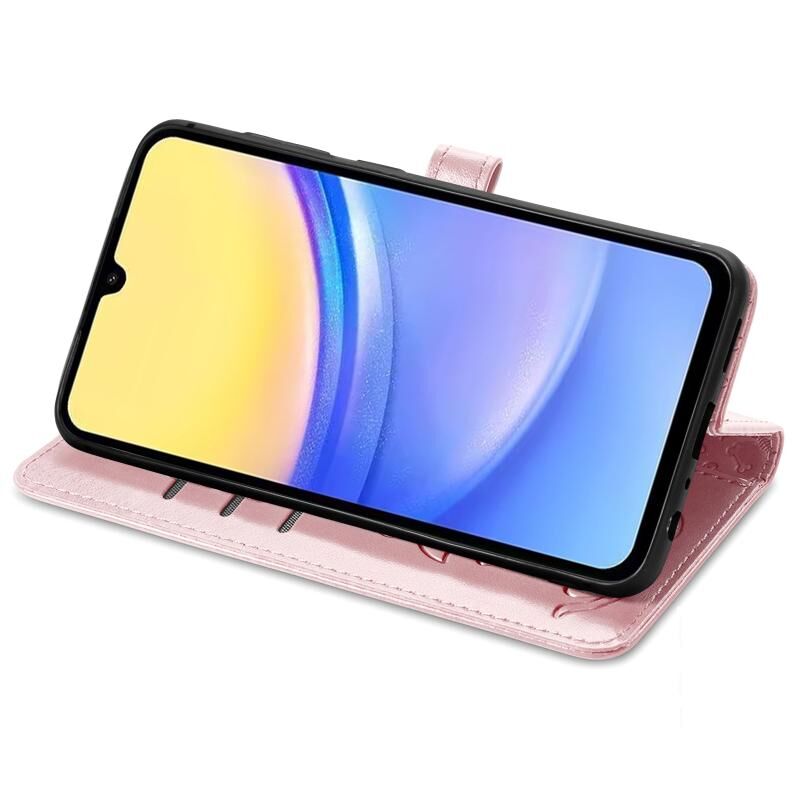 Θήκη τηλεφώνου Samsung Galaxy A15 με ανάγλυφο σχέδιο γάτας και σκύλου από δέρμα (Ροζ χρυσός)