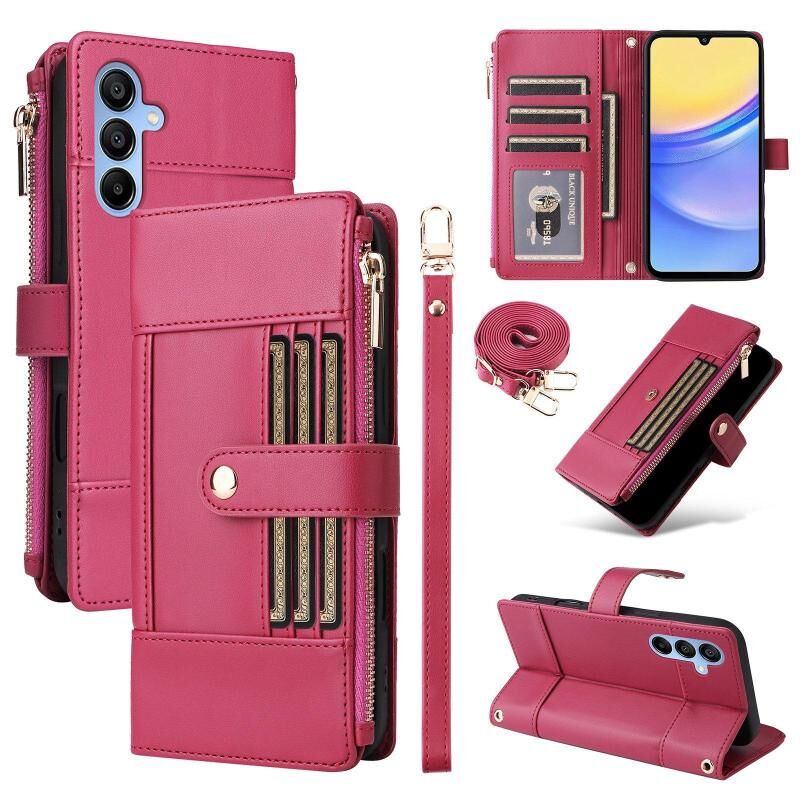 Θήκη τηλεφώνου Samsung Galaxy A16 / 26 από δέρμα με φερμουάρ, μπλοκάρισμα RFID και λουρί crossbody (Χρυσό ροζ)