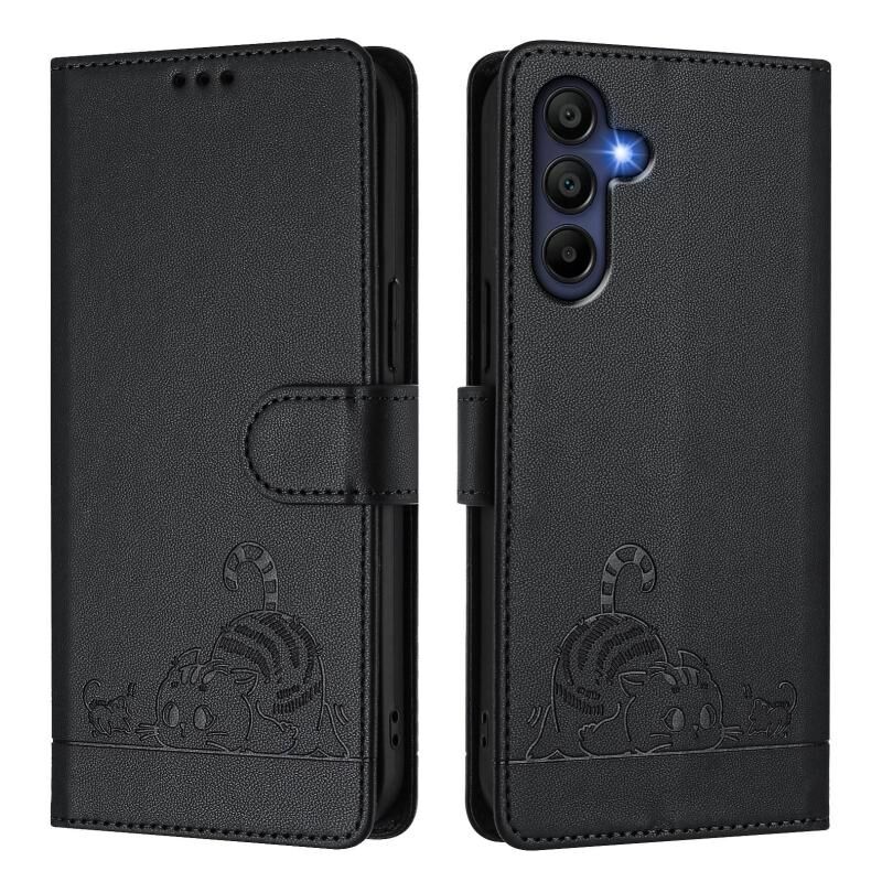Θήκη τηλεφώνου Samsung Galaxy A16 4G με ανάγλυφο σχέδιο γάτας και σκίουρου, δερμάτινη με προστασία RFID και λουρί (Μέντας Πράσινο)