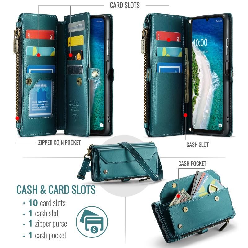 3. Άφθονος Χώρος Αποθήκευσης: Διαθέτει 10 θήκες για κάρτες, 1 θήκη για χρήματα, 1 θήκη με φερμουάρ και 1 τσέπη για χρήματα για εύκολη αποθήκευση. (Βασίζεται στην εικόνα)