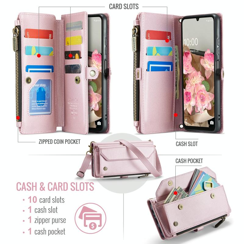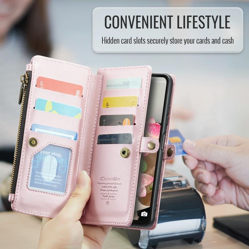 3. Άφθονος Χώρος Αποθήκευσης: Διαθέτει 10 θήκες για κάρτες, 1 θήκη για χρήματα, 1 θήκη με φερμουάρ και 1 τσέπη για χρήματα για εύκολη αποθήκευση. (Βασίζεται στην εικόνα)