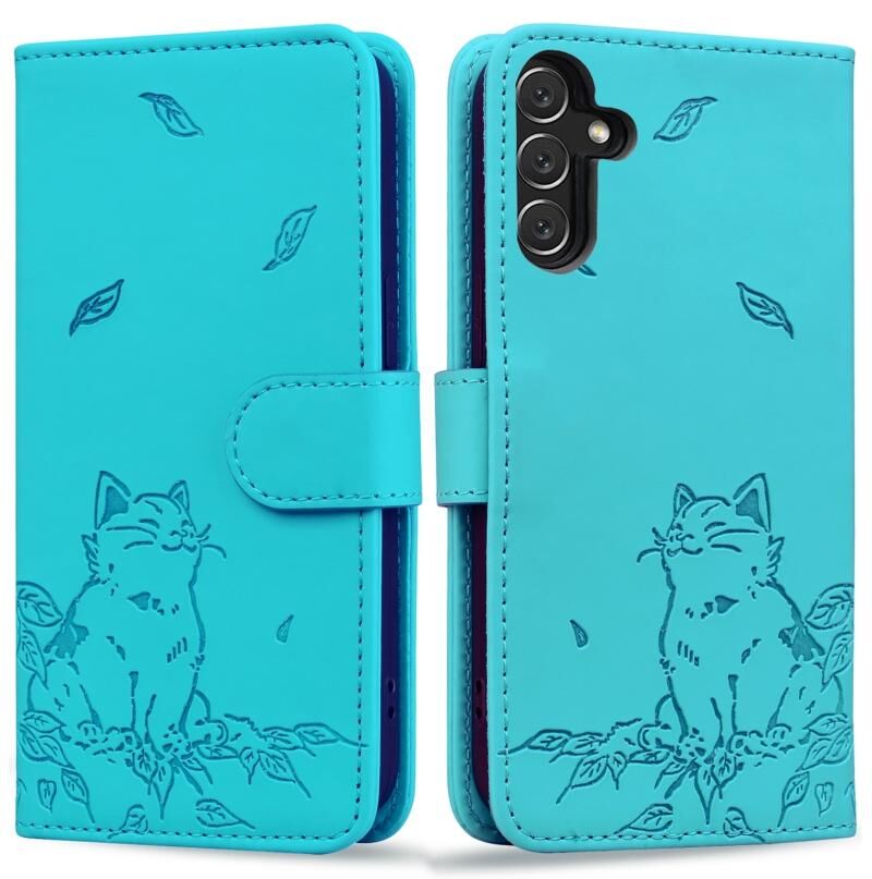 Θήκη τηλεφώνου Samsung Galaxy A16 5G από δέρμα με ανάγλυφο σχέδιο χαριτωμένης γάτας (Γαλάζια Λίμνης)