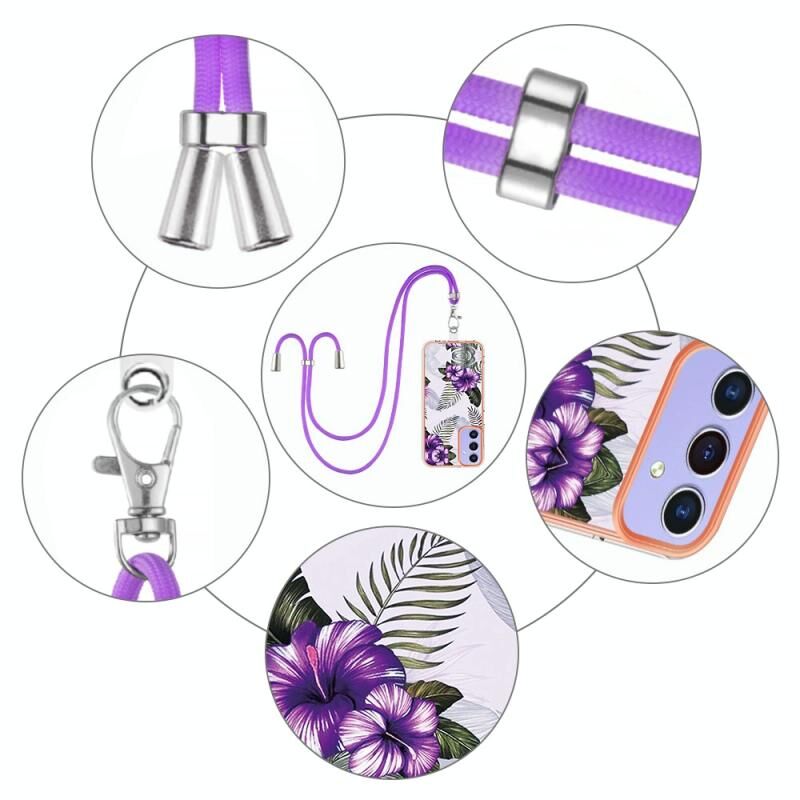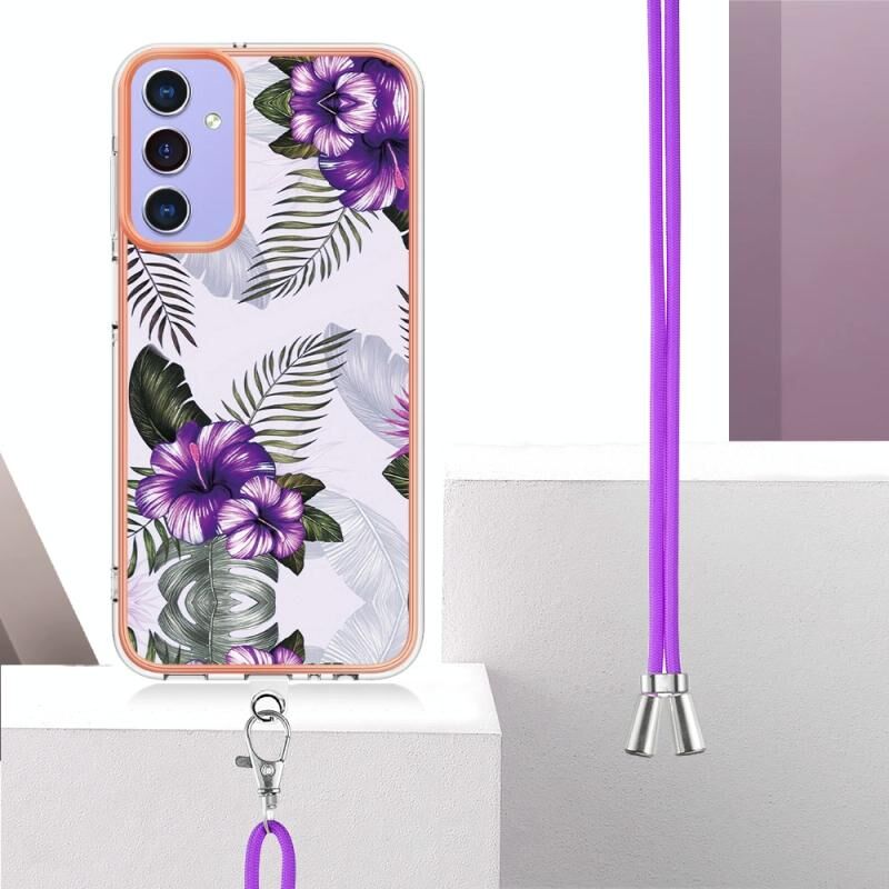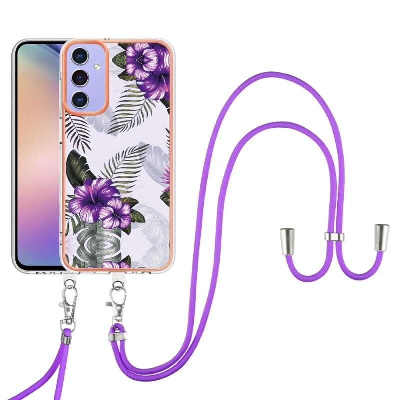 Θήκη για Samsung Galaxy A16 5G με σχέδιο ηλεκτρολυτικής επιμετάλλωσης IMD, TPU ανθεκτική στις κρούσεις με λουρί λαιμού (Μωβ Λουλούδι)
