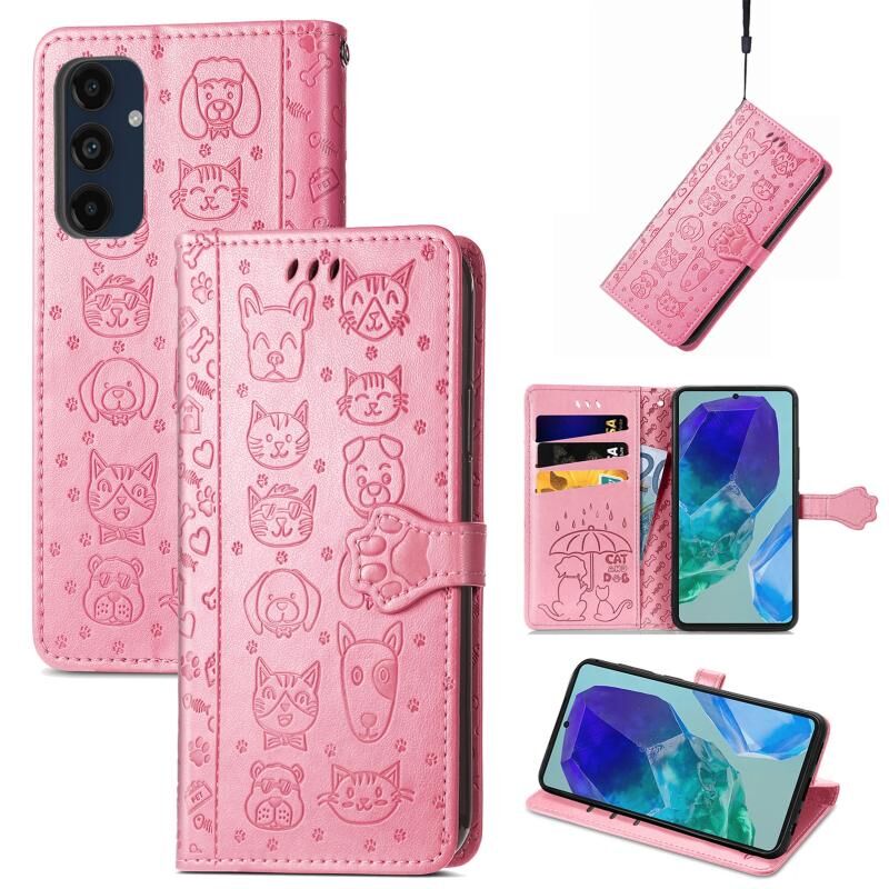 Θήκη τηλεφώνου Samsung Galaxy A16 με ανάγλυφο σχέδιο γάτας και σκύλου από δέρμα (Μωβ)