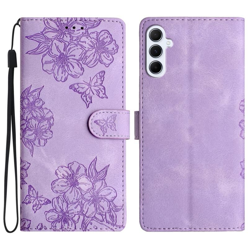 Θήκη τηλεφώνου Samsung Galaxy A17 5G Cherry Blossom Butterfly με ανάγλυφη υφή PU (Μωβ)