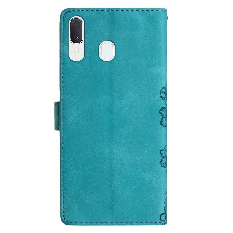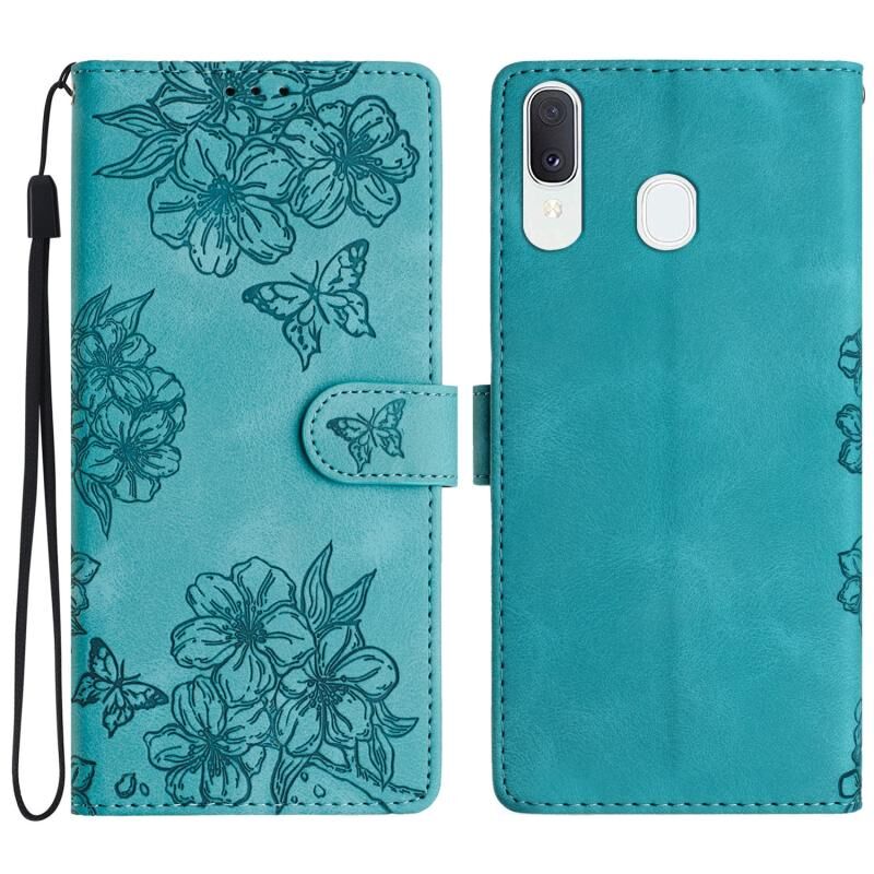 Θήκη τηλεφώνου Samsung Galaxy A20 / A30 με ανάγλυφο PU, αίσθηση δέρματος, σχέδιο Cherry Blossom Butterfly (Μωβ)