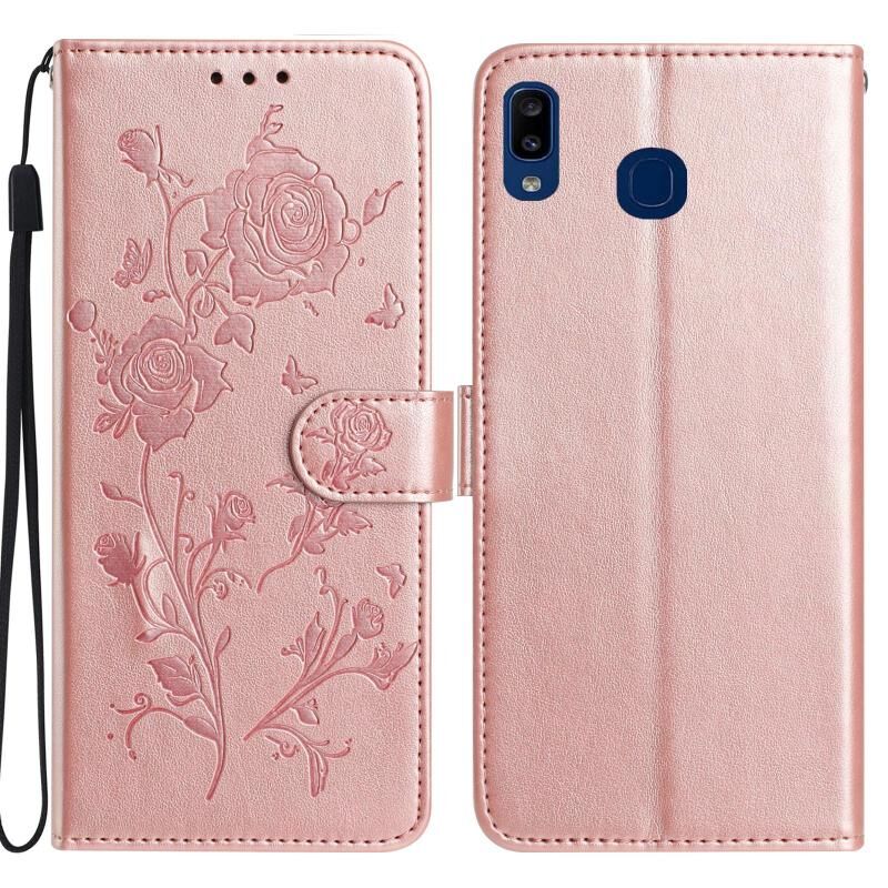 Θήκη τηλεφώνου δερμάτινη με ανάγλυφο σχέδιο ροζ λουλουδιού για Samsung Galaxy A20 / A30 (Ροζ Χρυσό)