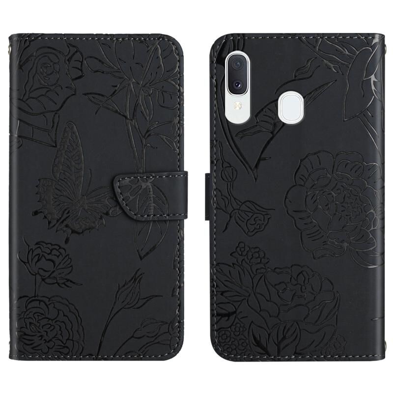 Θήκη τηλεφώνου Samsung Galaxy A20 / A30 από δέρμα με ανάγλυφο σχέδιο πεταλούδας και παιώνιας (Μαύρο)