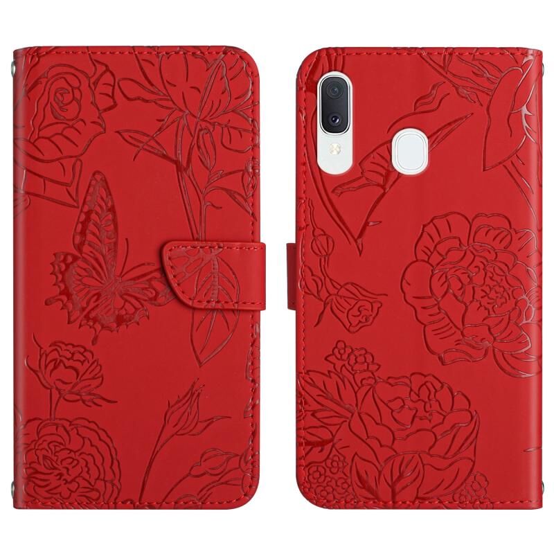 Θήκη τηλεφώνου Samsung Galaxy A20 / A30 από δέρμα με ανάγλυφο σχέδιο πεταλούδας και παιώνιας (Κόκκινο)
