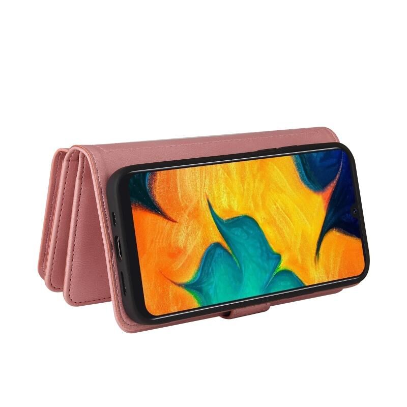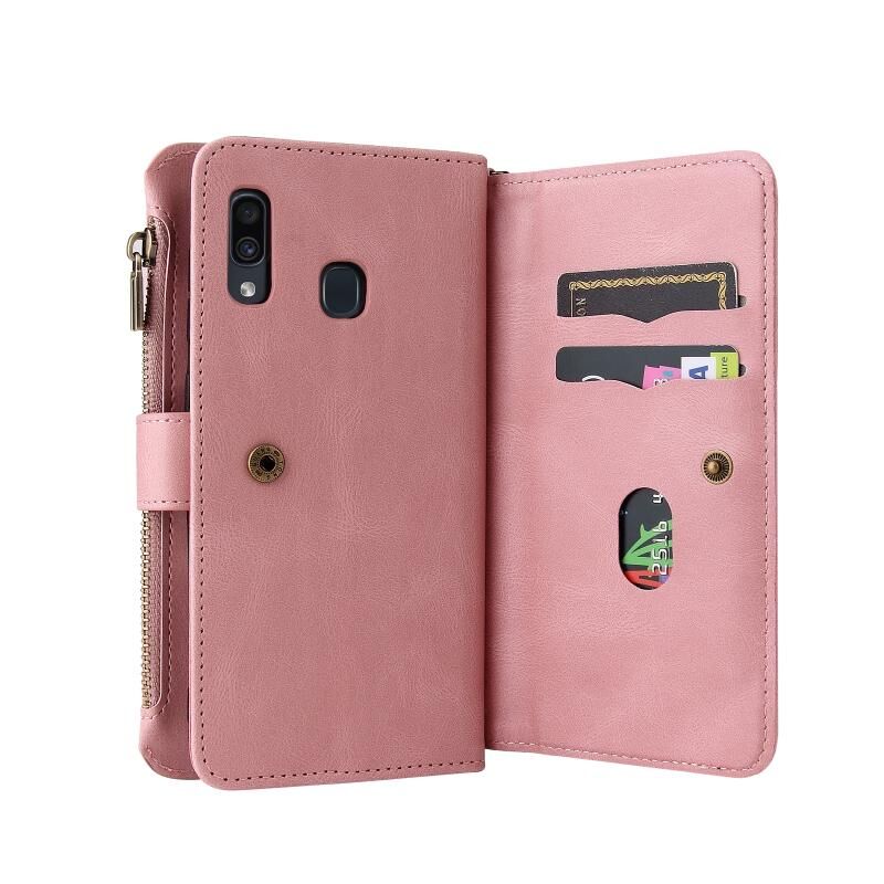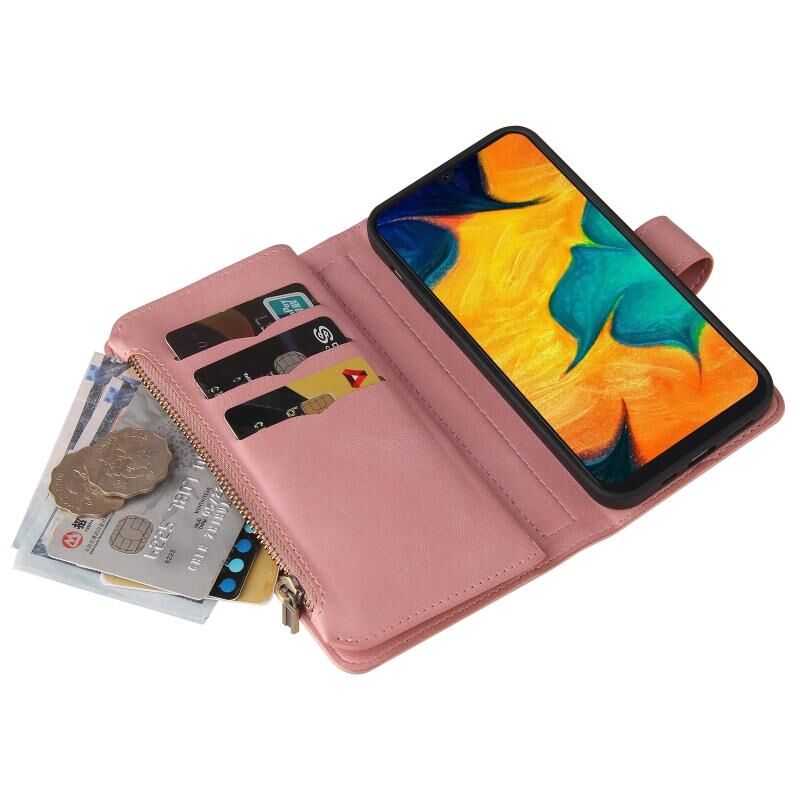 Για Samsung Galaxy A20 / A30 δέρμα αίσθηση PU + TPU οριζόντια Flip δερμάτινη θήκη με υποδοχή & 15 κάρτες Slot & πορτοφόλι & φερμουάρ τσέπη & Lanyard (ροζ)