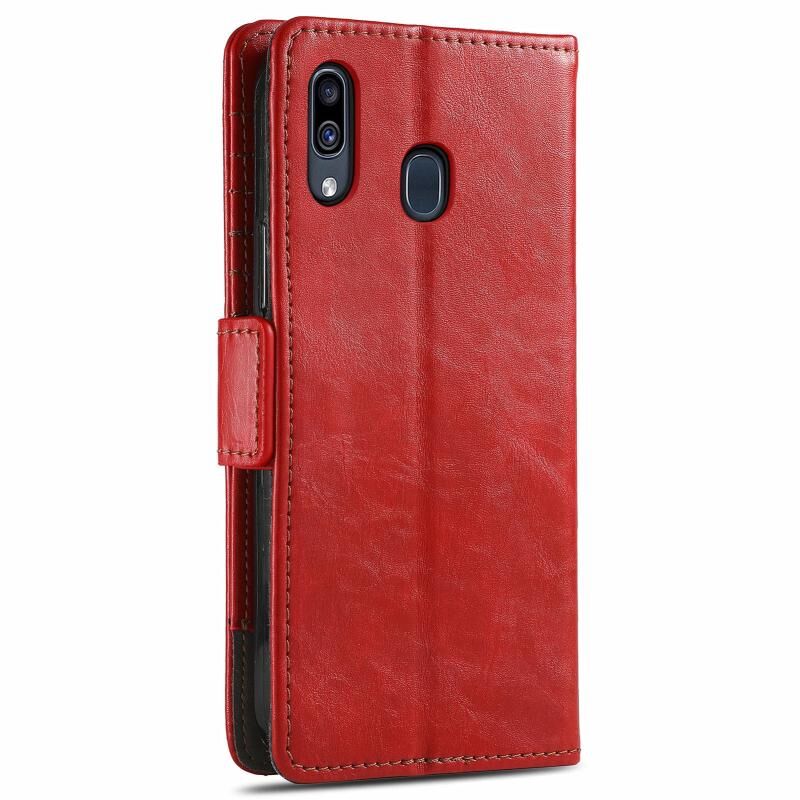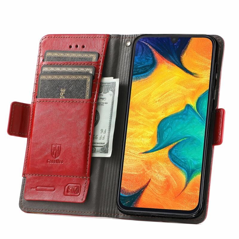Για Samsung Galaxy A20 CaseNeo Business Splicing Διπλή μαγνητική πόρπη οριζόντια Flip PU δερμάτινη θήκη με κάτοχο & υποδοχές για κάρτες & πορτοφόλι (κόκκινο)