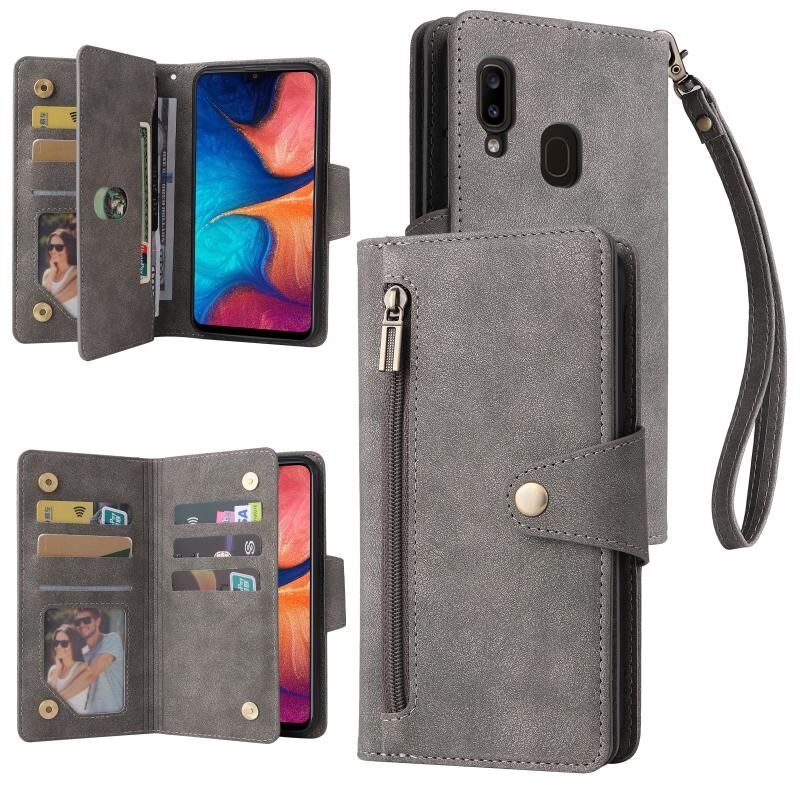Για Samsung Galaxy A20 Rivet πόρπη 9 κάρτες τρεις φορές δερμάτινη θήκη τηλεφώνου (γκρι)