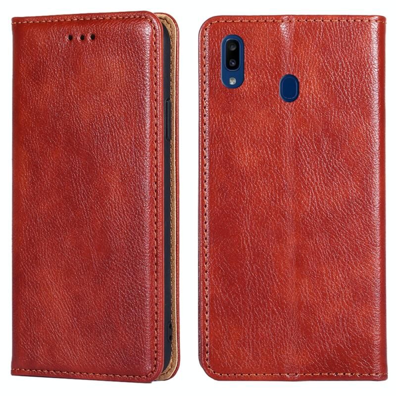 Για Samsung Galaxy A20e PU + TPU γυαλιστερό λάδι στερεό χρώμα μαγνητική οριζόντια Flip δερμάτινη θήκη με υποδοχή & υποδοχή για κάρτες & πορτοφόλι (καφέ)