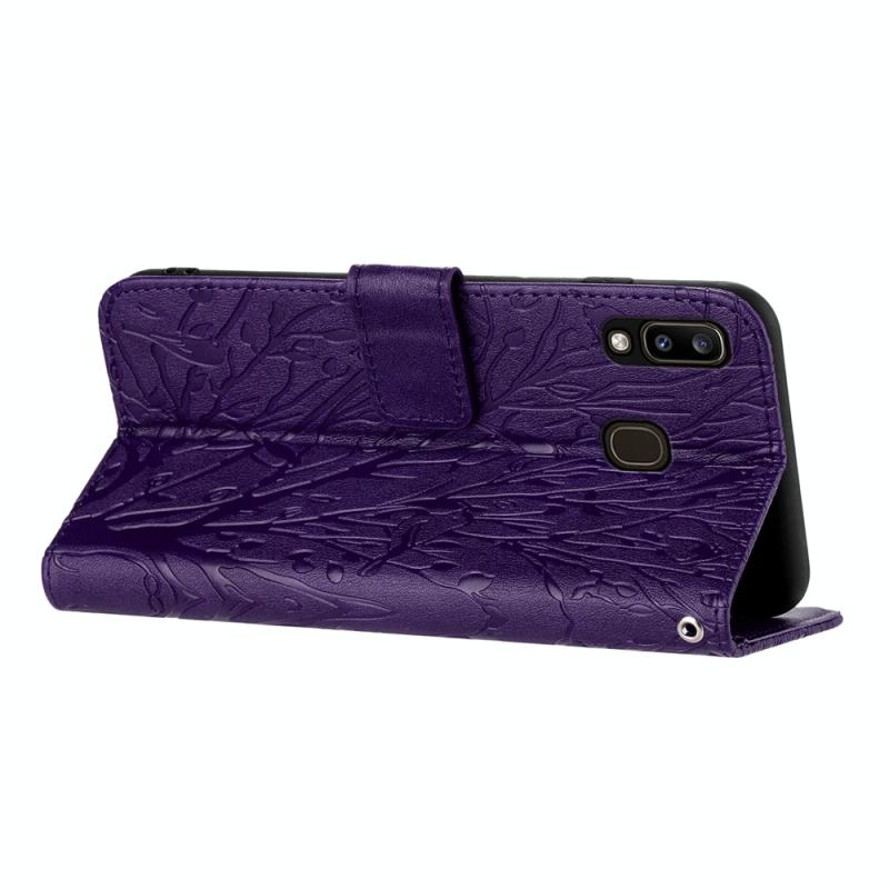For Samsung Galaxy A20e Tree Birds Embossed Pattern Leather Phone Case(Purple)