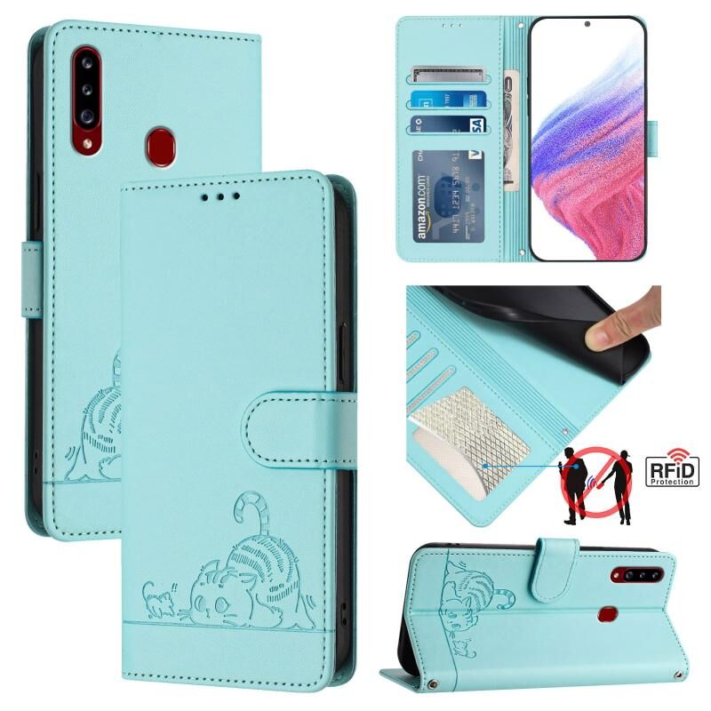 Θήκη κινητού Samsung Galaxy A20s από δέρμα με ανάγλυφο σχέδιο γάτας και ποντικιού, με κορδόνι (Μέντας Πράσινο)
