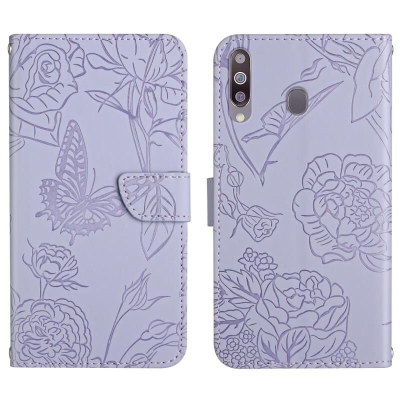 Θήκη τηλεφώνου Samsung Galaxy A20s με δερμάτινη υφή, ανάγλυφο σχέδιο πεταλούδας και παιώνιας (Κόκκινο)